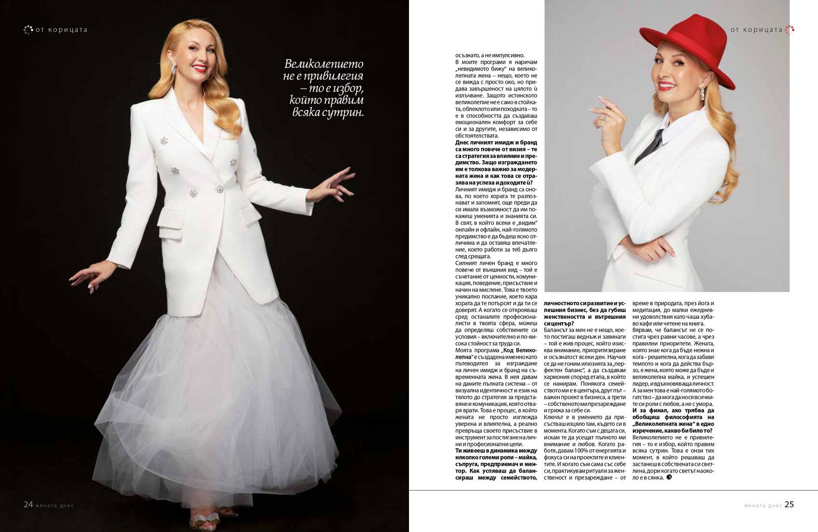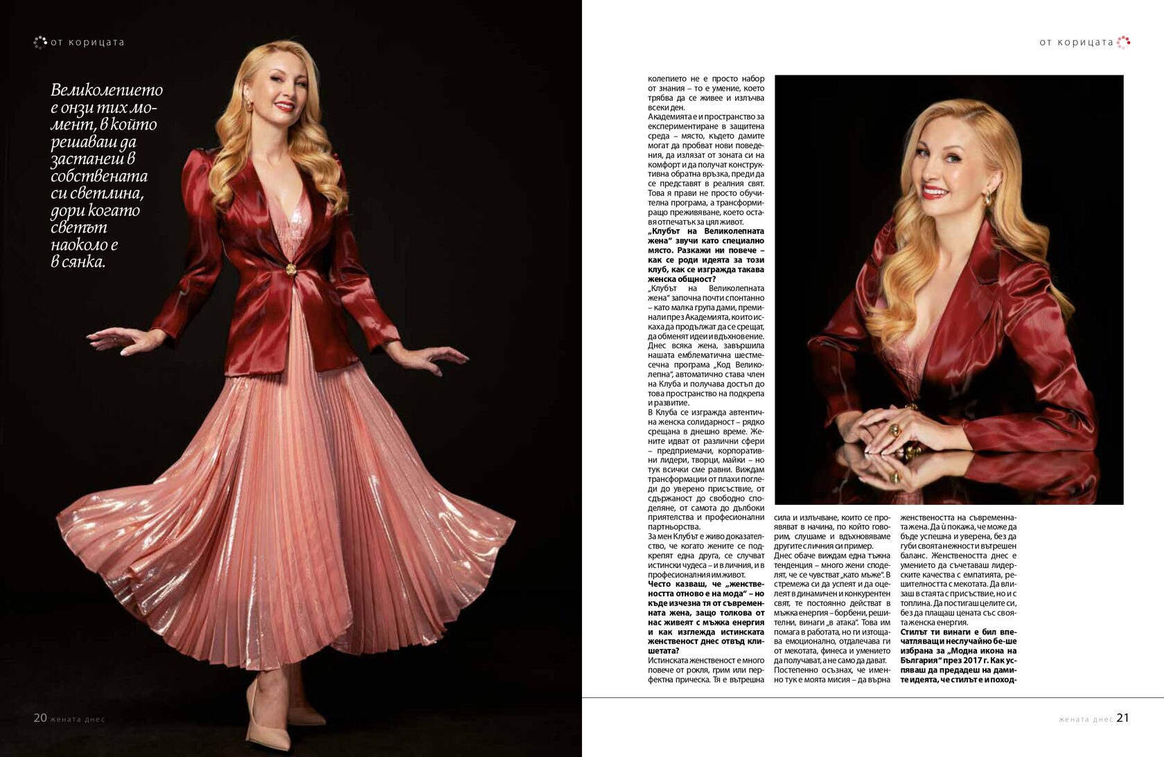 На корицата на септемврийския брой на списание „Жената днес“ блести Йордана Димитрова – създател на Академия, Клуб и Списание Великолепната Жена. Тя е дама, превърнала личната си мисия в източник на вдъхновение за стотици жени – да излъчват увереност, стил и женственост.