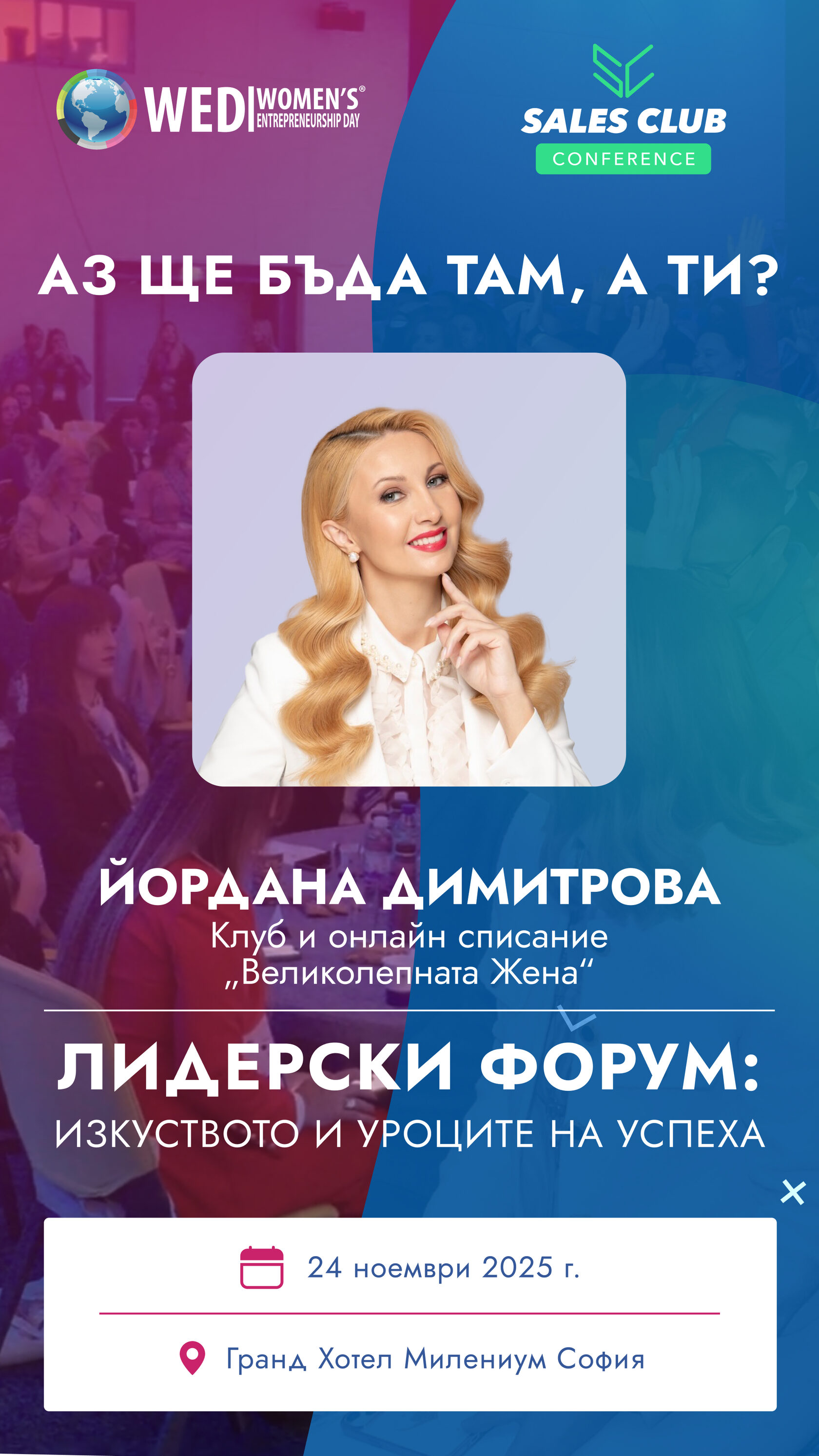 Денят на жената предприемач и Sales Club Conference обединяват сили, за да създадат платформа за лидери с визия и кауза. Това е уникален шанс за предприемачи, мениджъри и иноватори да се потопят в динамиката на съвременния бизнес свят и да научат как да изграждат устойчиви и социално ангажирани решения.